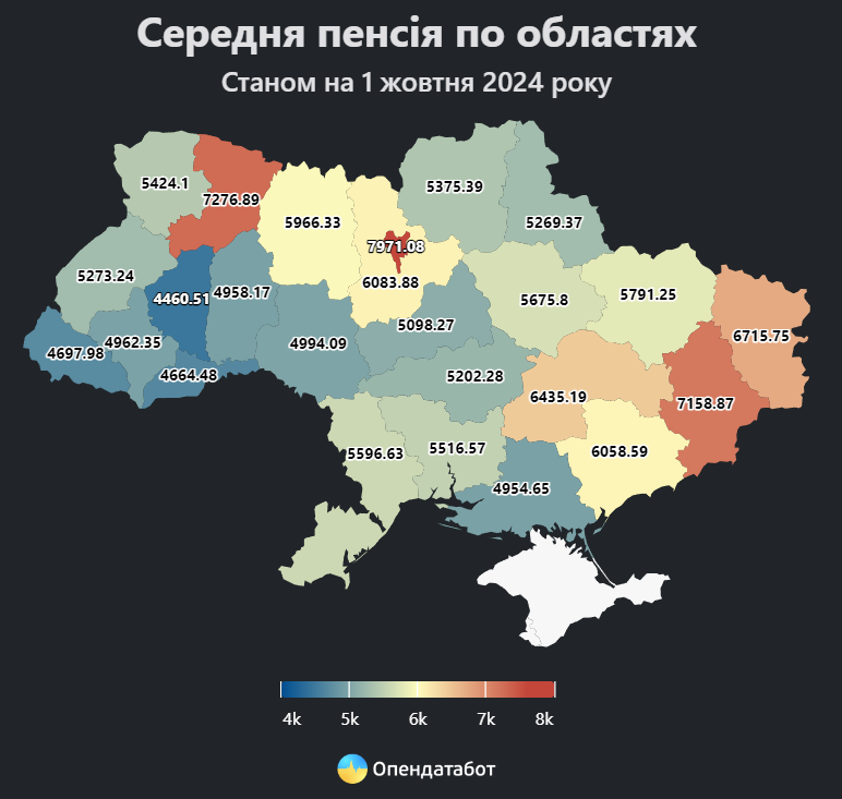 Найменші виплати у Тернопільській (4 тисячі 460 гривень), Чернівецькій (4 тисячі 664 гривні) та Закарпатській (4 тисячі 697 гривень) областях.