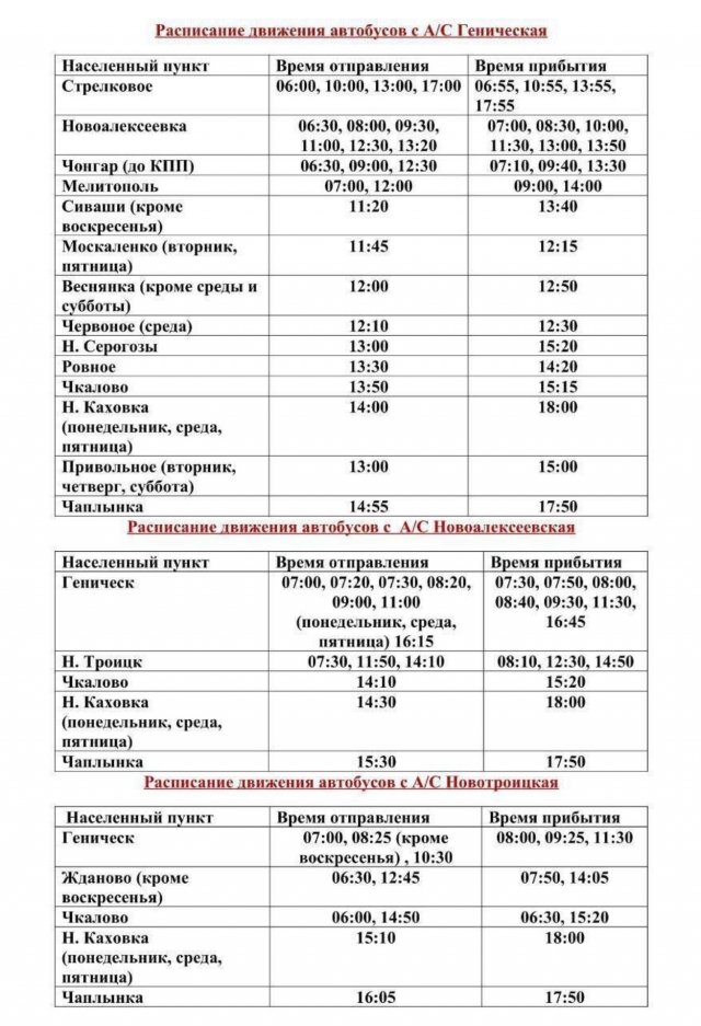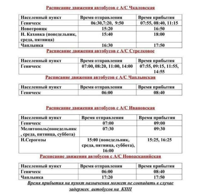 Так звана адміністрація Генічеського «муніципального округу» опублікувала у своєму телеграм-каналі докладний графік руху автобусів по автостанціях. І, на щастя, поки що з окупованого лівобережжя можна виїхати на підконтрольну уряду України територію. Проте коштує це для переважної більшості населення дуже дорого - до 450-500 доларів за місце у бусі.