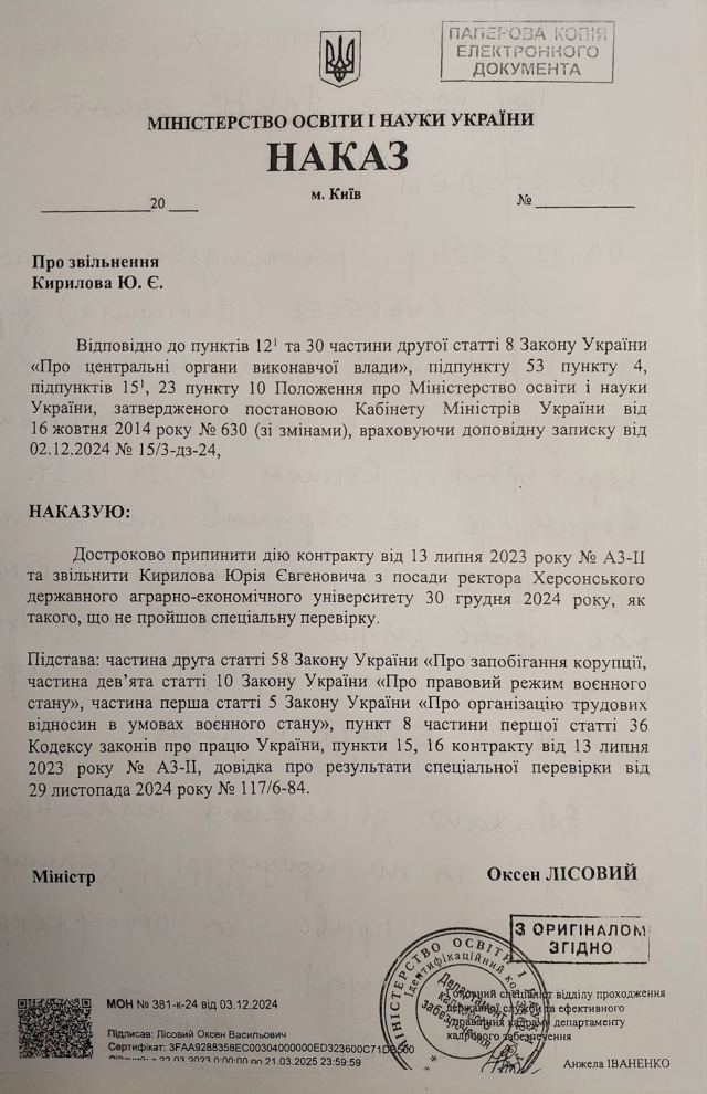 З ректором Херсонського державного аграрно-економічного університету Юрієм Кириловим Міністерство освіти та науки України достроково припинило контракт.Про це повідомляє «Антикорупційний вимір» із посиланням на сторінку Юрія Кирилова у Фейсбук.