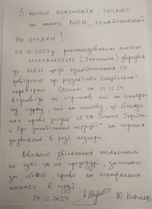 У наказі йдеться про те, що контракт із ректором достроково припинили за результатами проведеної спеціальної перевірки. Кирилов у своїй відповіді зазначає, що його лист, в якому він висловив незгоду із результатами перевірки, МОН проігнорував. Своє звільнення він вважає незаконним і має намір оскаржити наказ у суді.