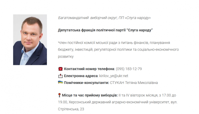 Юрій Кирилов — чинний депутат Херсонської міської ради від «Слуги народу». Попри те, що фактично Херсонська міська рада з 2022 року не працює (її поки замінила Херсонська міська військова адміністрація), депутати в ній лишаються, якщо не складуть своїх повноважень. Наразі 17 депутатів з 54-х у Херсоні склали свої повноваження, ще у двох повноваження припинені через вироки суду. Кирилов — чинний депутат.