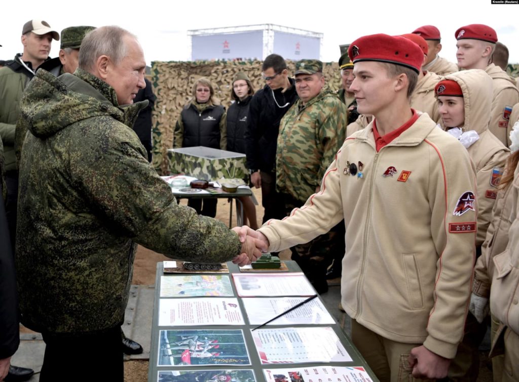 Володимир Путін під час зустрічі із «юнармійцями». Вересень 2019 року«Що стосується діяльності «Юнармії» на окупованих територіях, маємо розуміти, що вона була створена із особливою ідеєю мілітаризованого перевиховання не тільки російських, але так само українських дітей з окупованих територій», – зазначає вона.