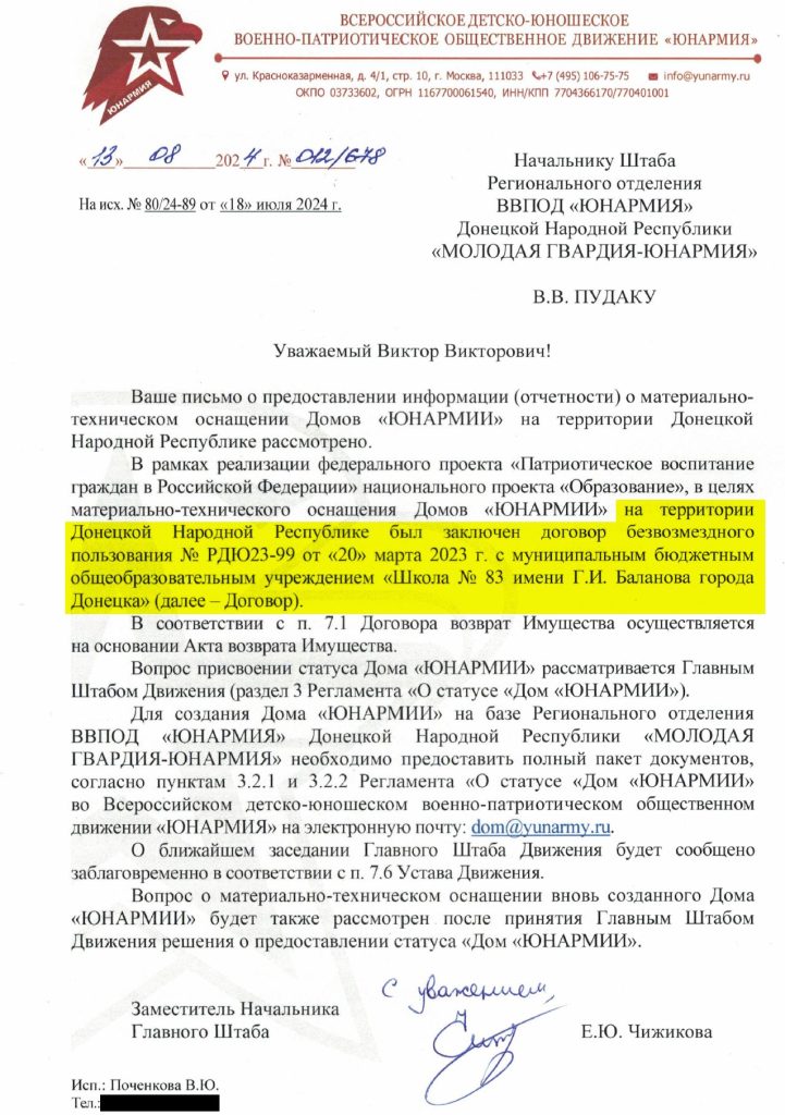 За інформацією з витоку документів угруповання «ДНР», які журналісти отримали від українських гакерів KibOrg, приміщення шкіл для потреб «Юнармії» надають безкоштовно. Це передбачено федеральною ініціативою «Патріотичне виховання громадян в Російській Федерації» національного проєкту «Освіта».