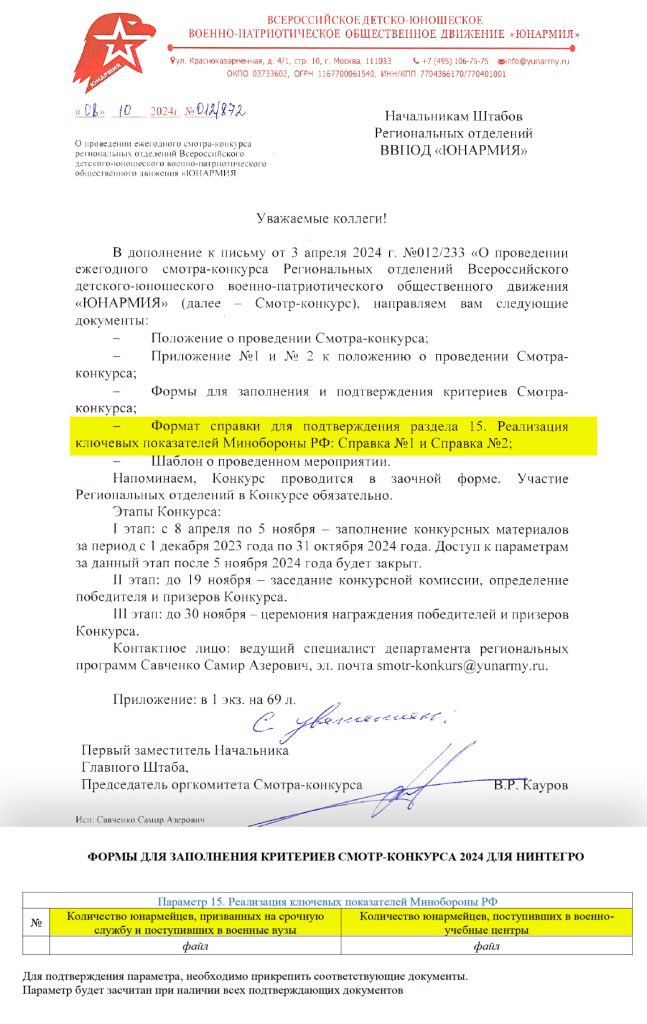 Відповідно до даних із витоку, у жовтні 2024 року перший заступник начальника головного штабу «Юнармії» Віктор Кауров розіслав листи регіональним осередкам про проведення обов’язкового щорічного «смотр-конкурсу». У них ідеться про те, що штаби-переможці визначать після оцінки наданих документів. Зокрема – довідки для підтвердження 15 пункту («Реалізація ключових показників Міноборони РФ»).