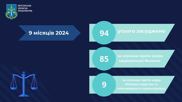 Судами першої інстанції за участі прокурорів області винесено обвинувальні вироки стосовно 94 осіб. З них 85 засуджені за злочини проти основ національної безпеки, ще 9 — за злочини проти миру, безпеки людства та міжнародного правопорядку.
