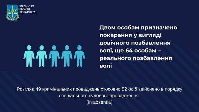 Зокрема, двом особам призначено покарання у вигляді довічного позбавлення волі, а 64 особам — реальне позбавлення волі.Розгляд 49 кримінальних проваджень стосовно 52 осіб здійснено за спеціальною процедурою судового провадження на підставі ч. 3 ст. 323 КПК України (in absentia).