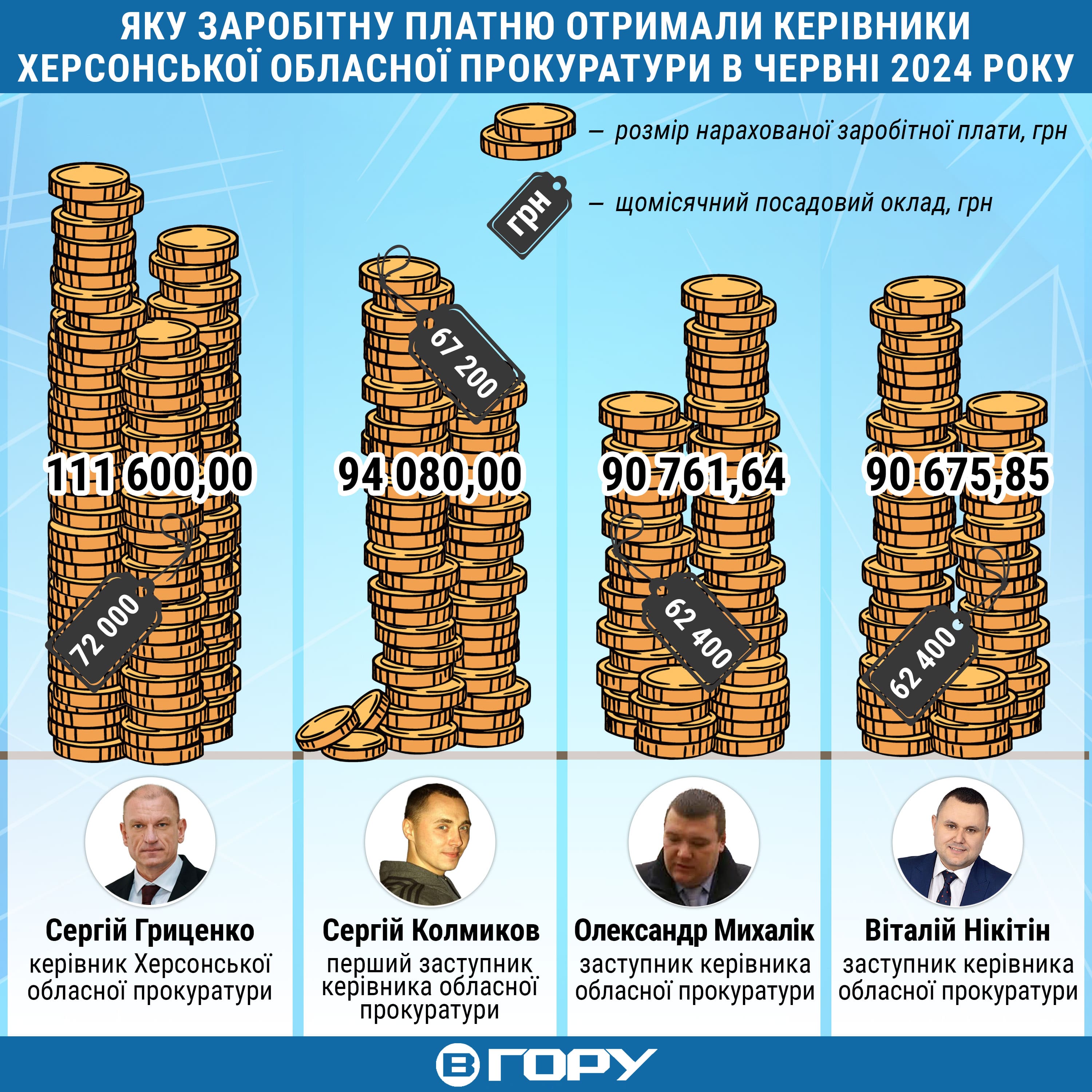 За червень 2024 року керівник Херсонської обласної прокуратури Сергій Гриценко отримав 111 тисяч 600 гривень заробітної плати, троє його заступників – 275 тисяч 517 гривень 49 копійок.