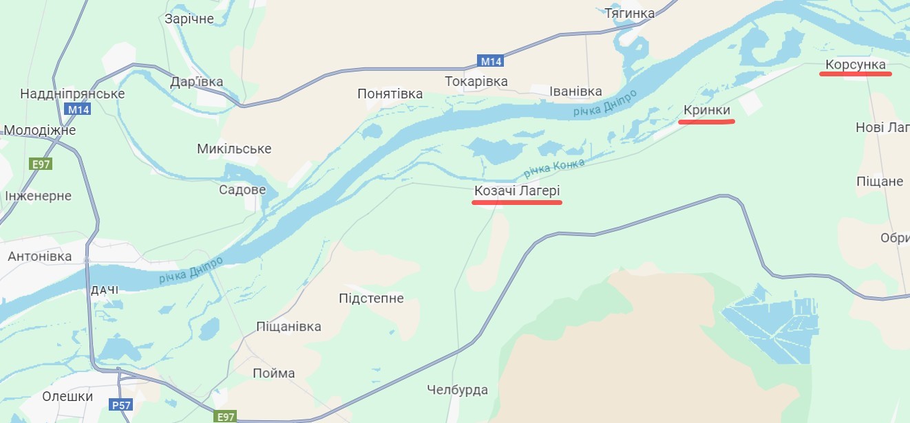 «Від 20 лютого плацдарм у Кринках не лише не зменшився, а навпаки – збільшився майже на 2 кілометри на захід. Усього ж за довжиною зона контролю в Кринках у Сил оборони України становить до 6 кілометрів. І очевидно, що пріоритетним напрямком для розширення плацдарму є саме Козачі Лагері», – повідомив 18 травня Олександр Коваленко.