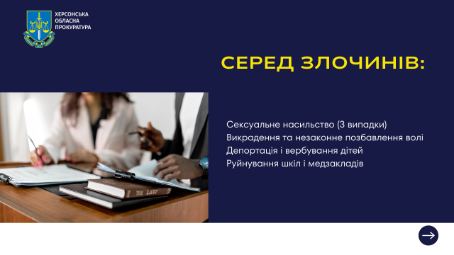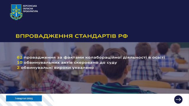 У першому кварталі 2025 року у одному кримінальному провадженні за фактом вчинення сексуального насильства щодо неповнолітньої дівчини, військовослужбовцю зс рф повідомлено про підозру у вчиненні кримінального правопорушення, передбаченого ч. 1 ст. 438 КК України. Наразі досудове розслідування триває.За процесуального керівництва органів прокуратури Херсонської області, розслідувалося 62 кримінальні провадження за фактами колабораційної діяльності громадян України, пов’язаної з впровадженням стандартів освіти держави-агресора.