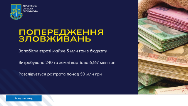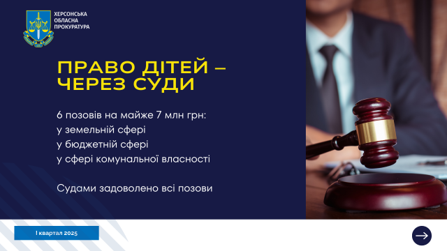 У сфері представництва інтересів держави в суді пріоритетними напрямами залишаються дотримання вимог законодавства у бюджетній та земельній сферах, а також з питань державної та комунальної власності. Так, органами прокуратури Херсонської області заявлено 6 позовів на суму майже 7 млн грн у сфері охорони дитинства, з них:• 1 – із земельних питань на понад 6 млн грн;