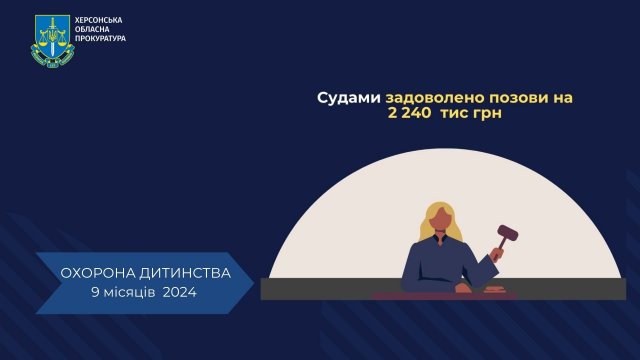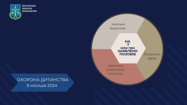 Прокурори Херсонщини активно захищають права дітей у бюджетній, земельній та комунальній сферах. Протягом 9 місяців до суду заявлено 15 позовів на майже 7 мільйонів гривень, з яких більшість стосуються питань комунальної та державної власності, а також земельних відносин.