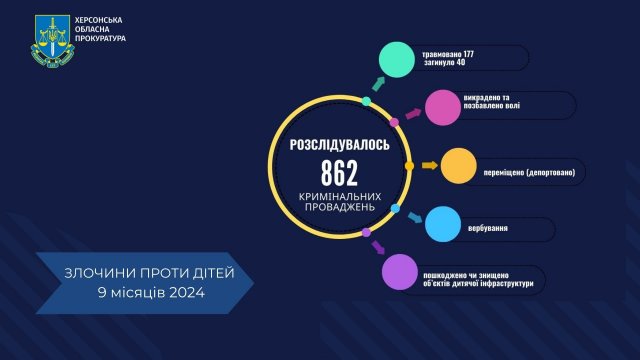Впродовж 9 місяців 2024 року під процесуальним керівництвом органів прокуратури Херсонської області розслідувались 862 кримінальні провадження, пов’язані зі збройною агресією рф проти України та злочинами, вчиненими стосовно дітей.