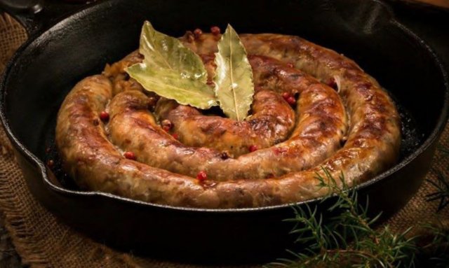 домашні ковбаси, борщ зі смаженою рибою (пишуть, що такий їли за часів Пушкіна), пиріг з раками та юшку по-чабанськи.