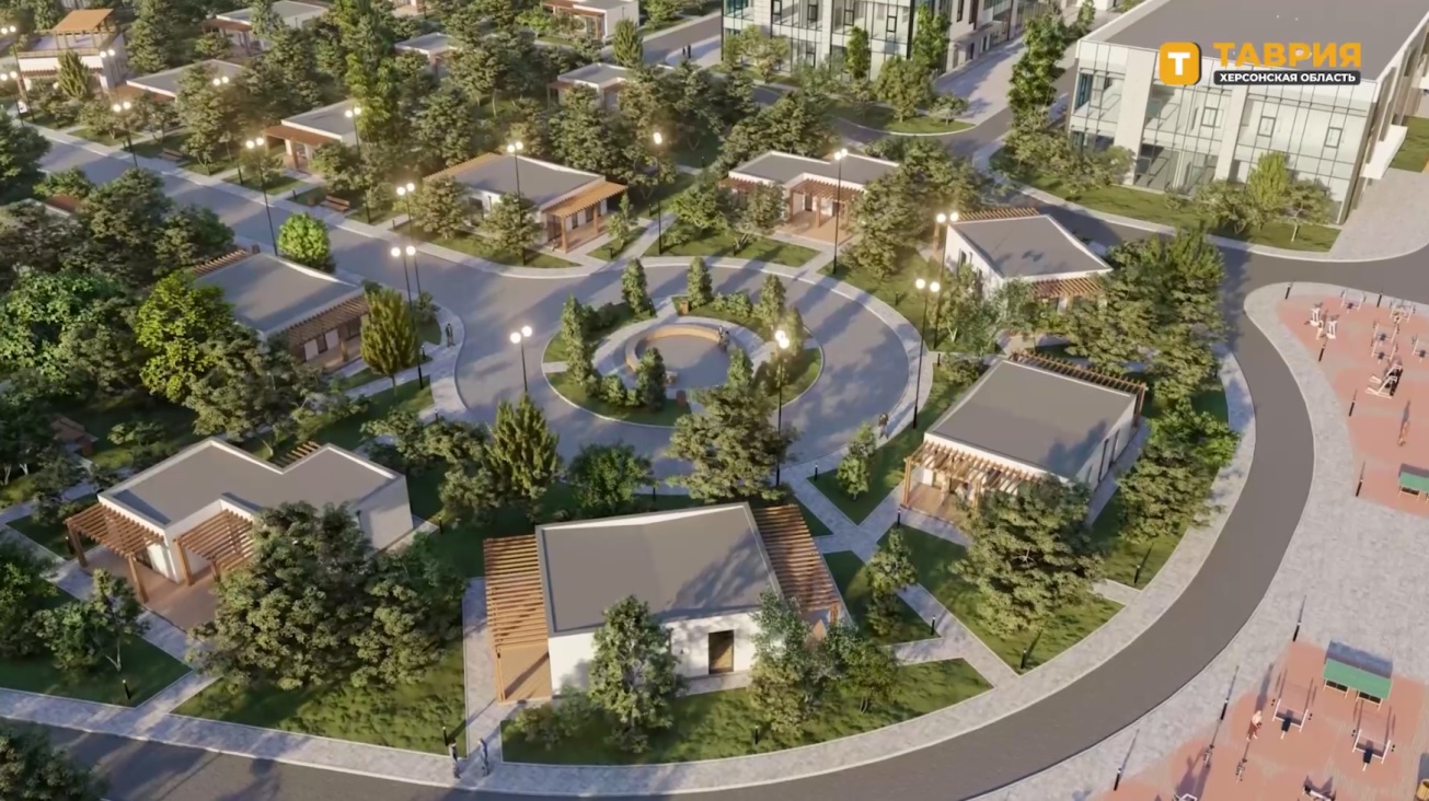 Візуалізація проєкта арт-кластера «Таврида» на Арабатській стрілці. Скріншот відео окупаційного ТРК «Таврия».При цьому пропагандисти засвітили, хто незаконно веде будівельні роботи на території вкраденої бази відпочинку «Ярославна», освоюючи мільйони Росмолодьожи. Це ТОВ «Специализированный застройщик «Гор-строй» (ІПН 2015041780) із Чечні.