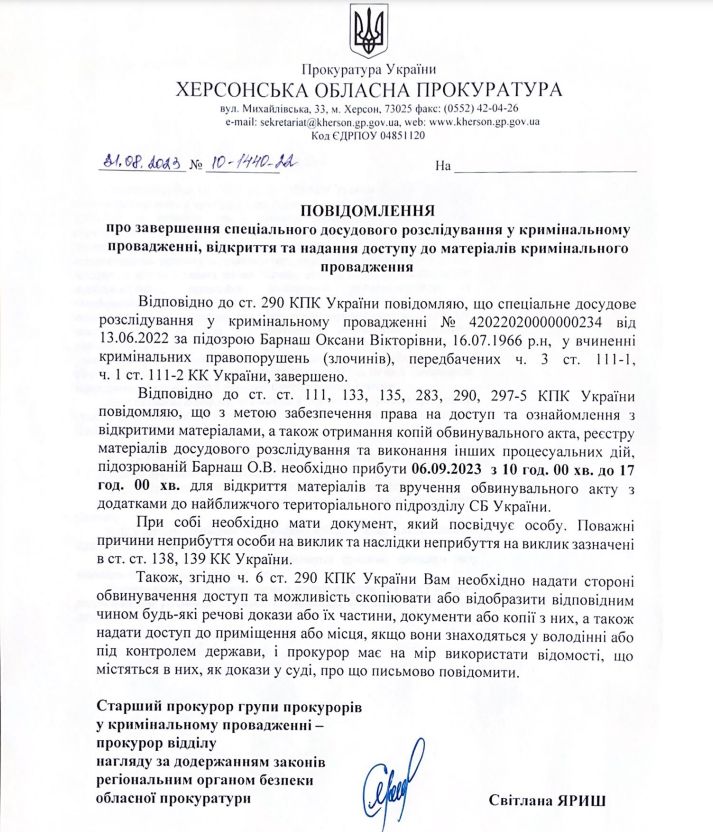 На 6 вересня 2023 року Оксану Барнаш запрошують ознайомитись із матеріалами справи.