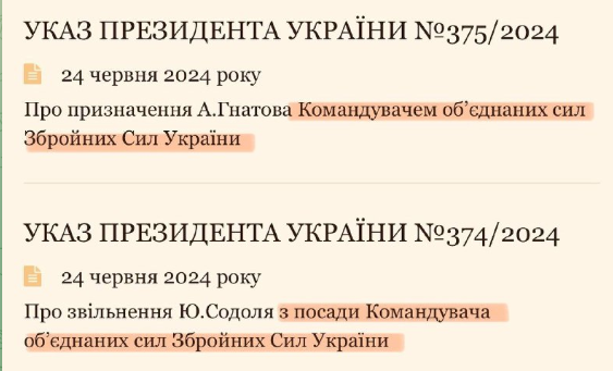 Президент Володимир Зеленський ухвалив рішення замінити командувача Об’єднаних сил ЗСУ генерал-лейтенанта Юрія Содоля на бригадного генерала Андрія Гнатова.