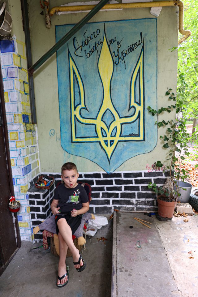 Всередині будинку на стінах жінка зобразила різні квіти та імітацію цегли, а зовні – герб із написом “Доброго вечора, ми з України”.