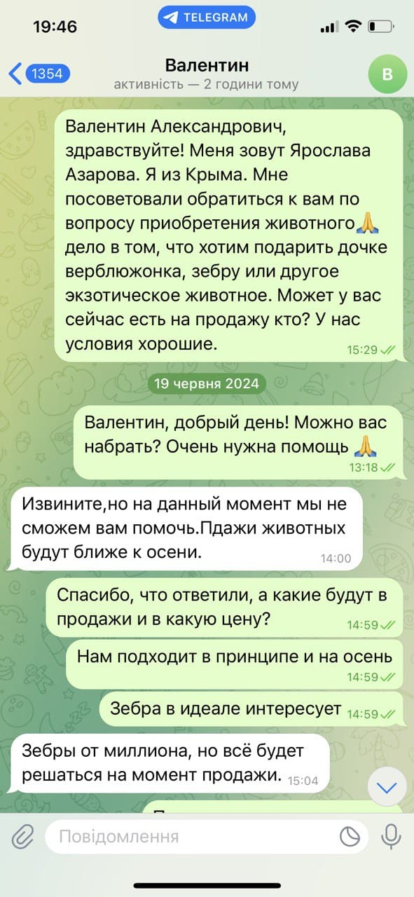 Журналісти поновили листування із Суботіним у червні 2025 року, з новою легендою — написали, що хочуть придбати тварину на день народження одному з окупаційних ватажків Криму. Фактично через рік Суботін повторив — тимчасово продаж призупинено.