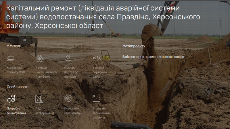 У селі Правдине на Херсонщині проходить капітальний ремонт зношеної системи водопостачання. Проєкт охоплює заміну майже п’яти кілометрів труб, модернізацію насосної станції, встановлення нового насосного обладнання та оновлення гідротехнічних споруд.
