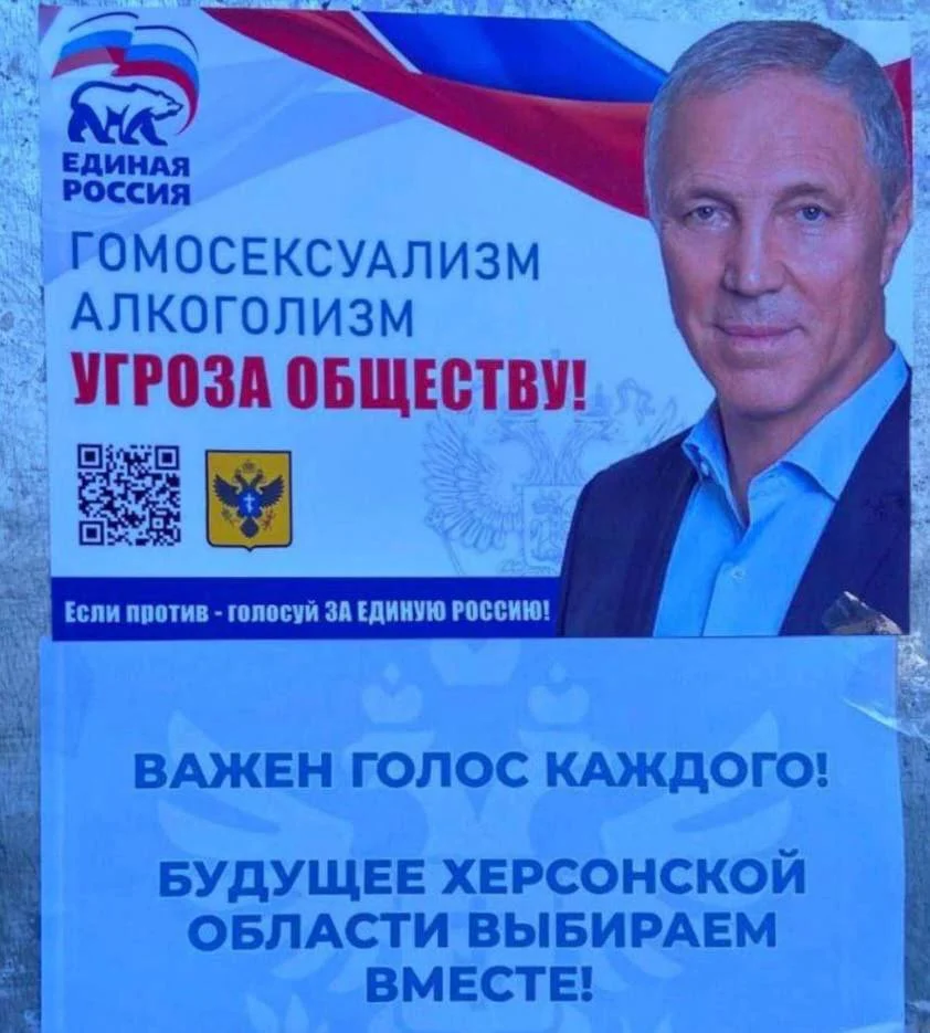 Зрадник Володимир Сальдо обліпив окуповану частину Херсонщини своїми бордами до фейкових виборів. Це реальні борди та гасла.«Гомосексуализм, сатанизм и алкоголизм угроза обществу!» — з такими лозунгами йде на «місцеві вибори» гауляйтер окупованої Херсонської області від провладної російської партії.