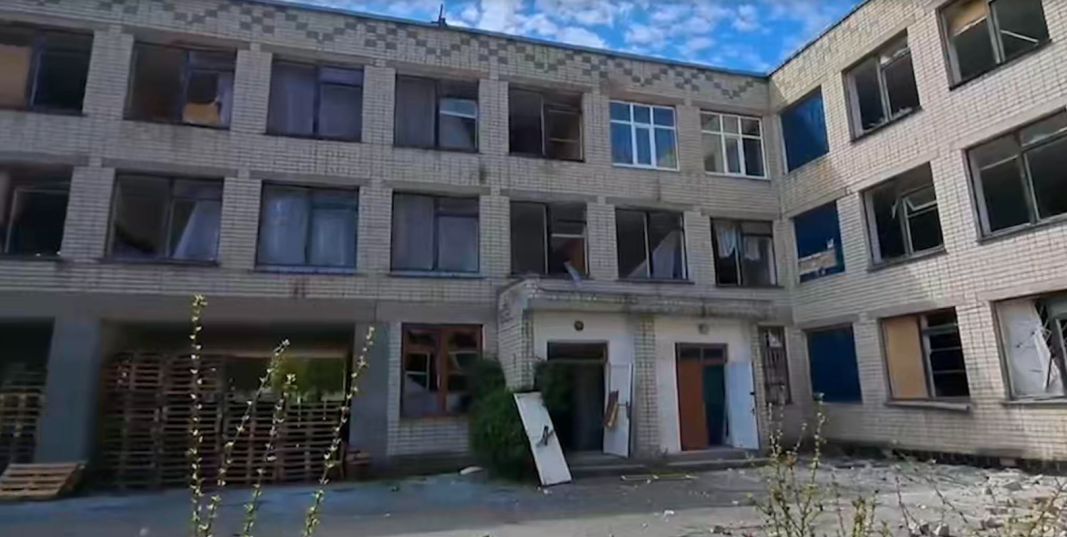Зруйнований під час російської окупації Новокаховський ліцей #6, який «очолила» Наталія Краюшкіна, 05.05.2023. Фото: скріншот відео