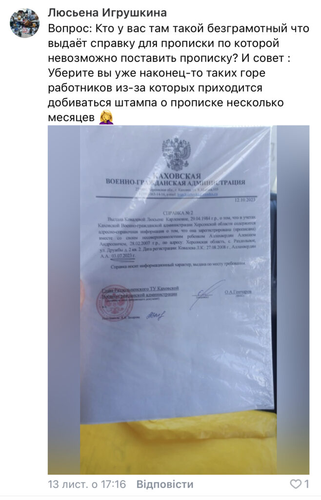 «Ви брешете кожним своїм словом. Саме в цьому «штабі» у мене забрали оригінал потрібної довідки і всі копії моїх документів там мають з вересня 2023 року. Від вашої брехні каховчанам уже тошно», – стверджує Махньова.