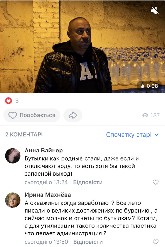 Нагадала Махньова представникам окупаційної адміністрації й про їхні гучні заяви про те, що для вирішення проблеми з водопостачанням після підриву Каховської ГЕС і знищення Каховського водосховища вони збираються бурити нові глибокі свердловини. Натомість, як свідчать дописи гауляйтера Павла Філіпчука і його заступників, у Каховці досі критично залежні від розфасованої у пляшки питної води, а саме централізоване водопостачання так і не відновлене, у кількох селах його досі немає.