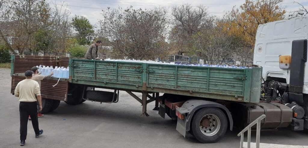 Досі окупантам доводиться завозити питну воду у пляшках мешканцям сусідніх із Каховкою сіл. Фото 27 жовтня 2023 року з окупаційних пабліків«Все літо писали про великі досягнення з бурінням свердловин, а зараз мовчок і звіти по завезенню води у пляшках. До речі, що для утилізації такої великої кількості пластику робить «администрация»? – запитала Ірина Махньова.