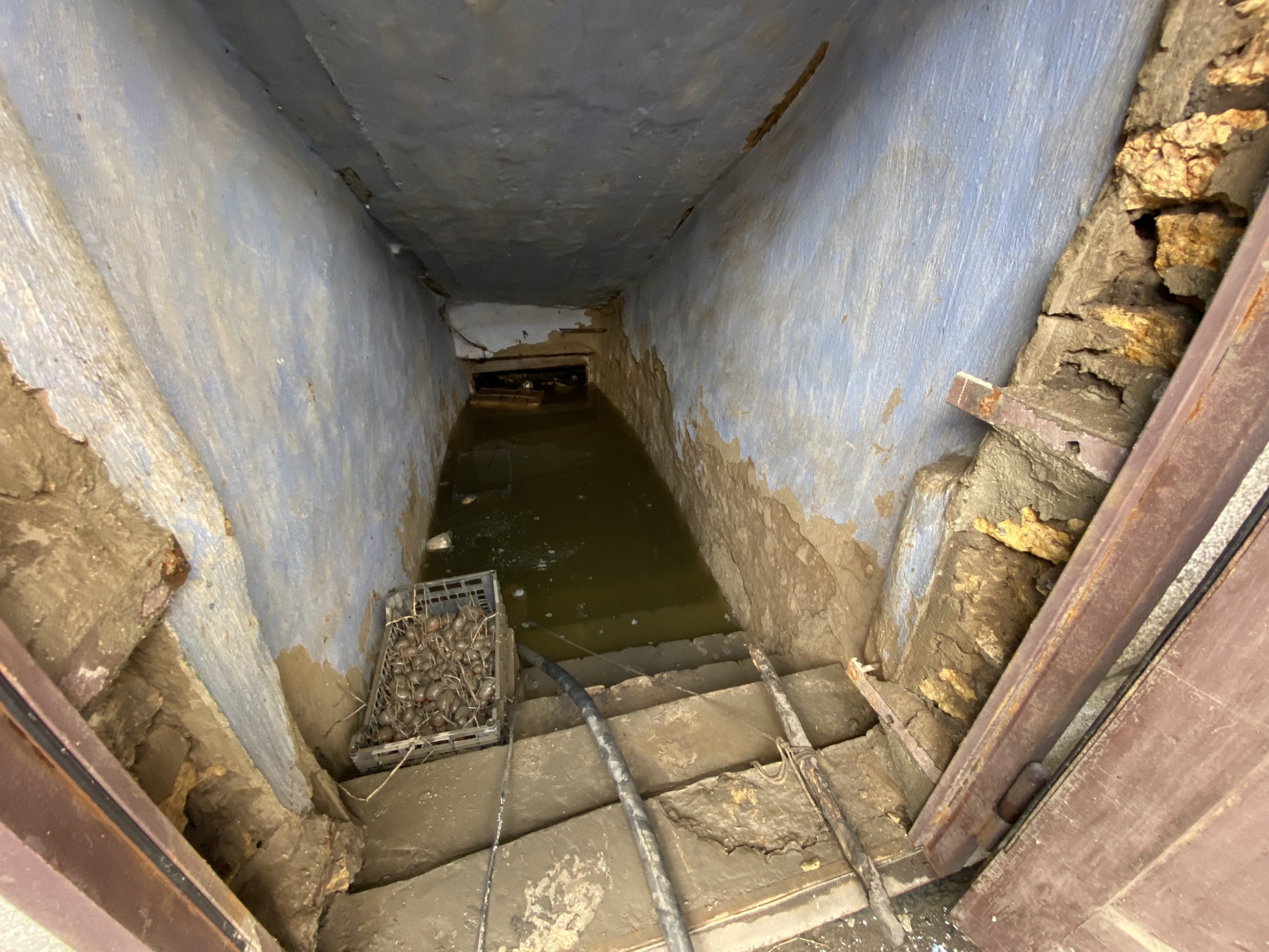У цьому підвалі подружжя зберігало консервацію й овочі, а зараз у ньому лише вода. Фото: Олеся Ланцман“Щоб не потягло ще й цю стіну. Бо вона вже видулася”, – пояснює Валентина.