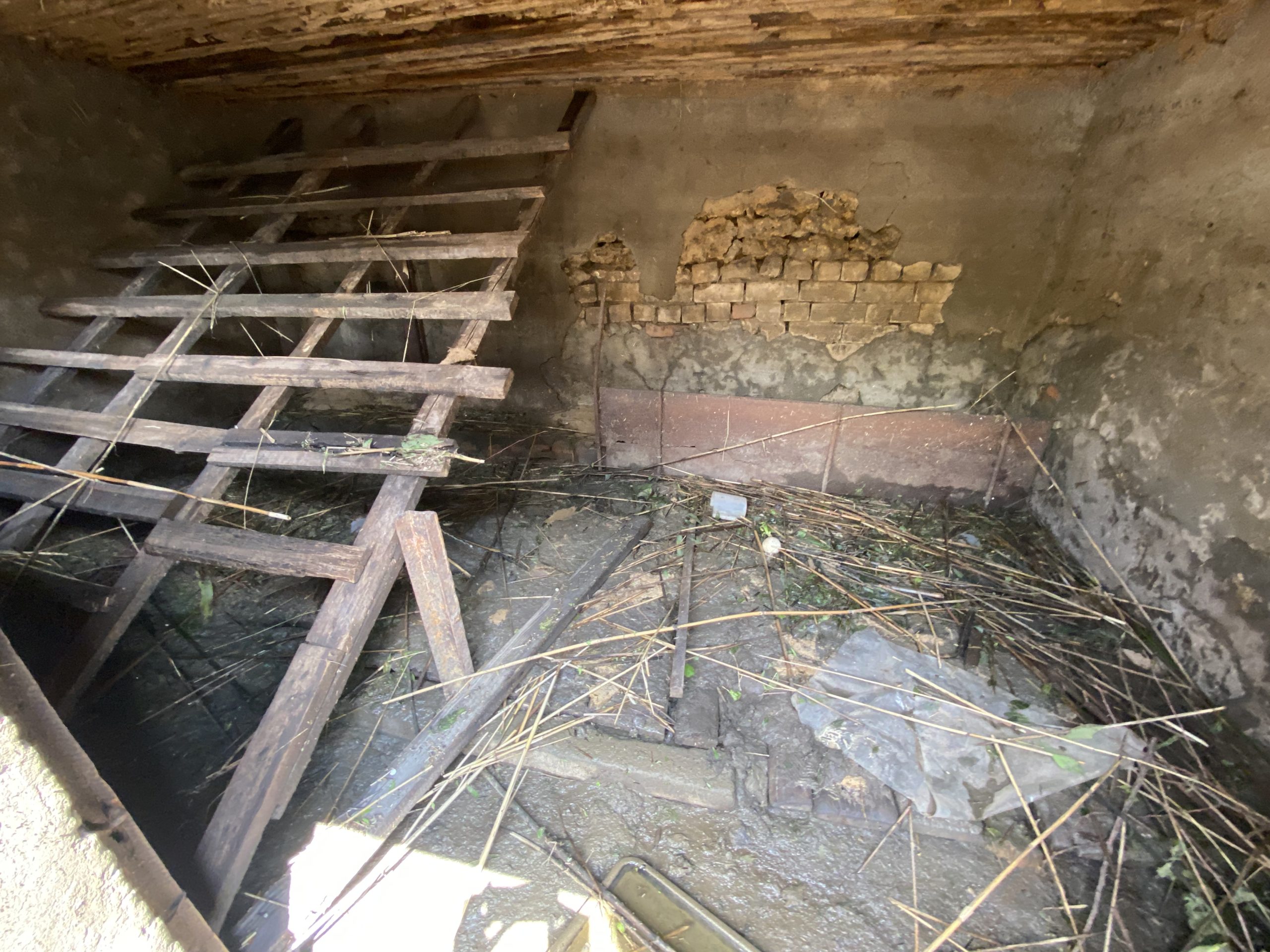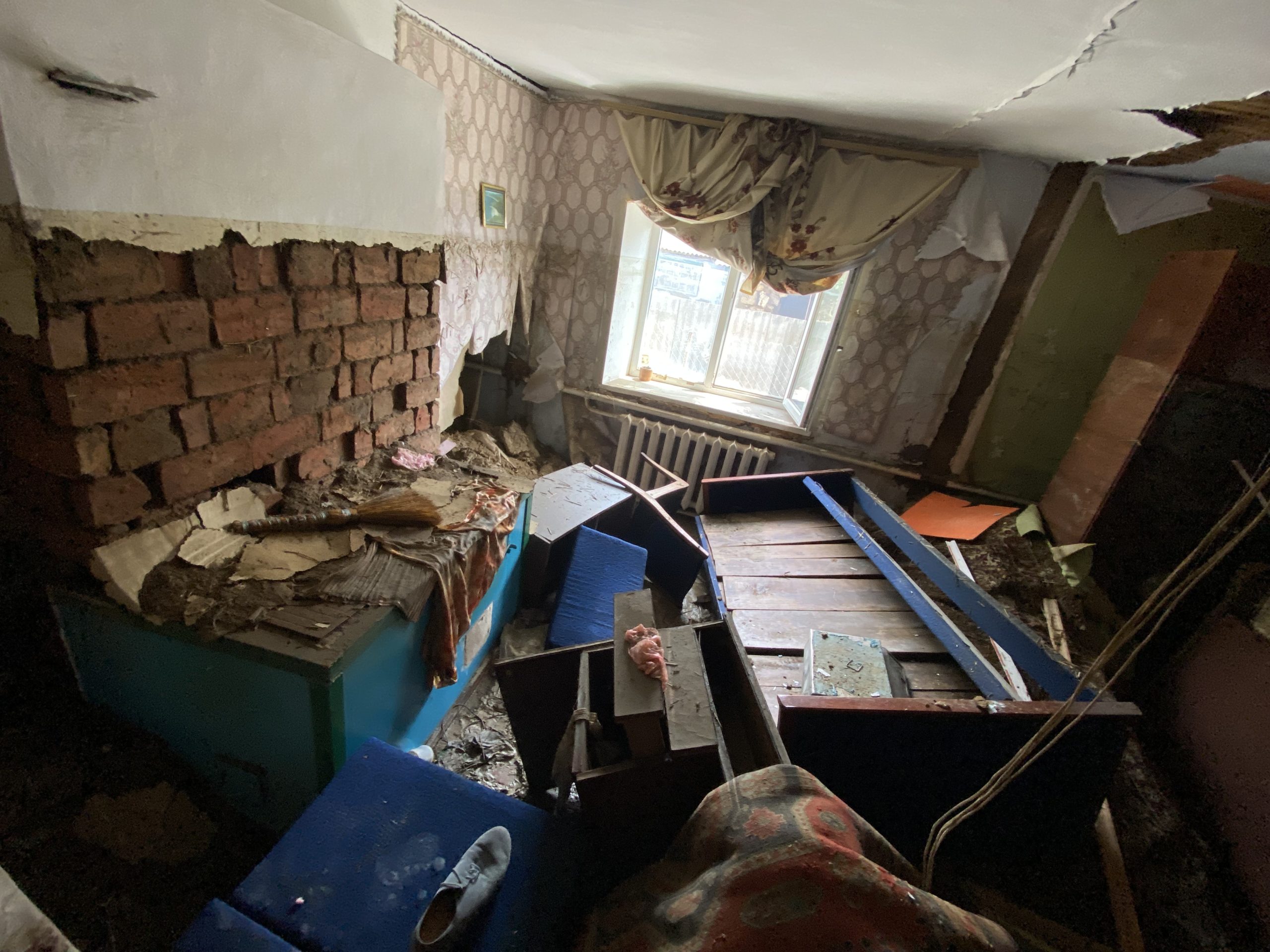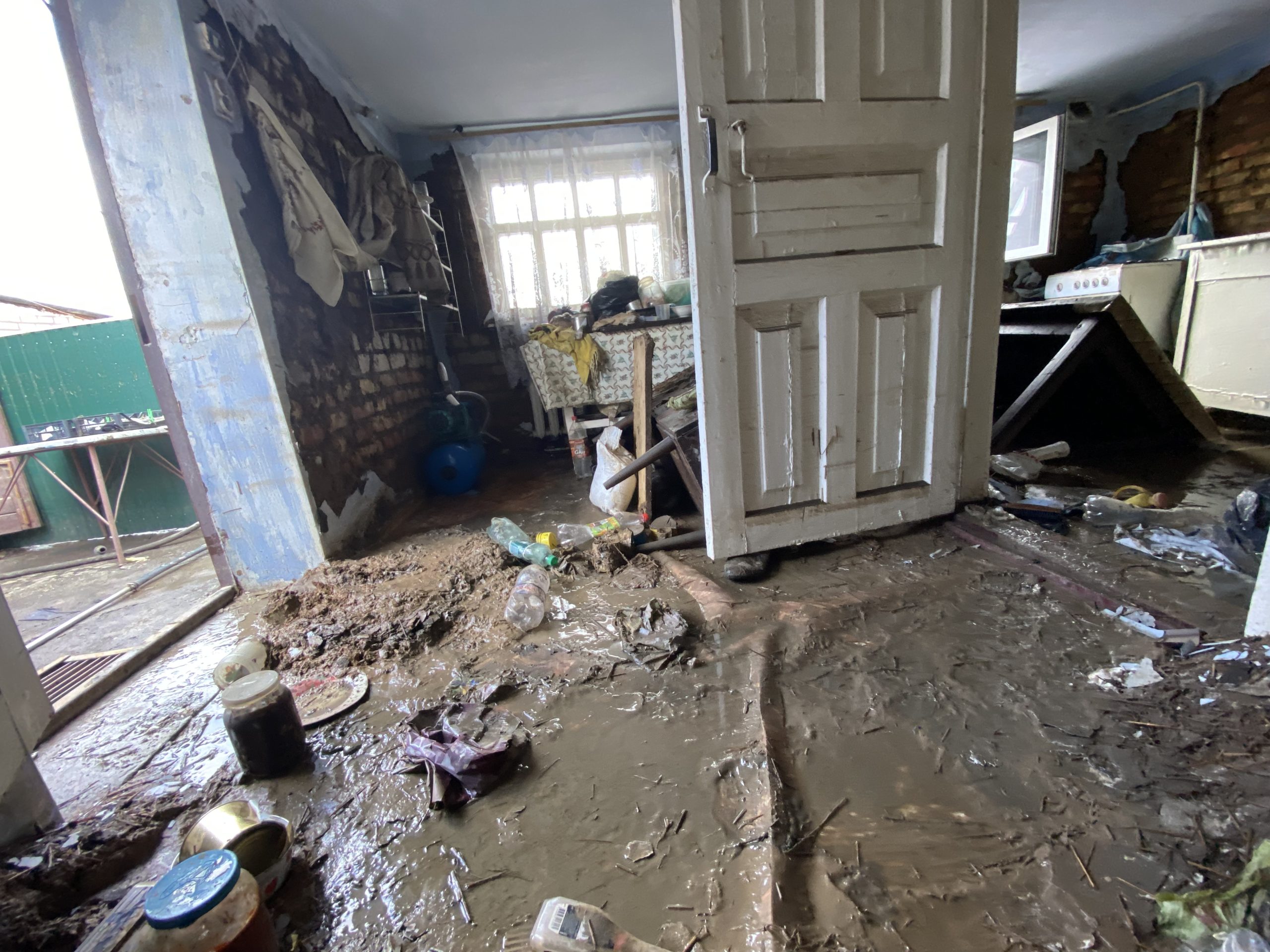 Такий вигляд мають майже всі кімнати в будинку Валентини. Фото: Олеся Ланцман Виходимо на подвір’я. Чоловік показує підвал, повний води, яку вони намагаються відкачати.