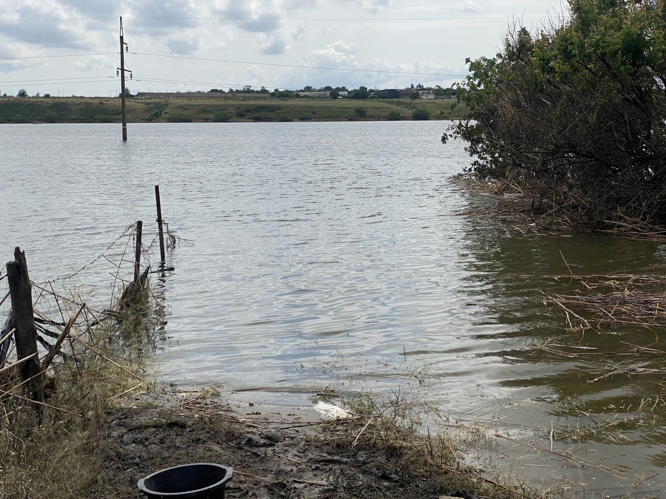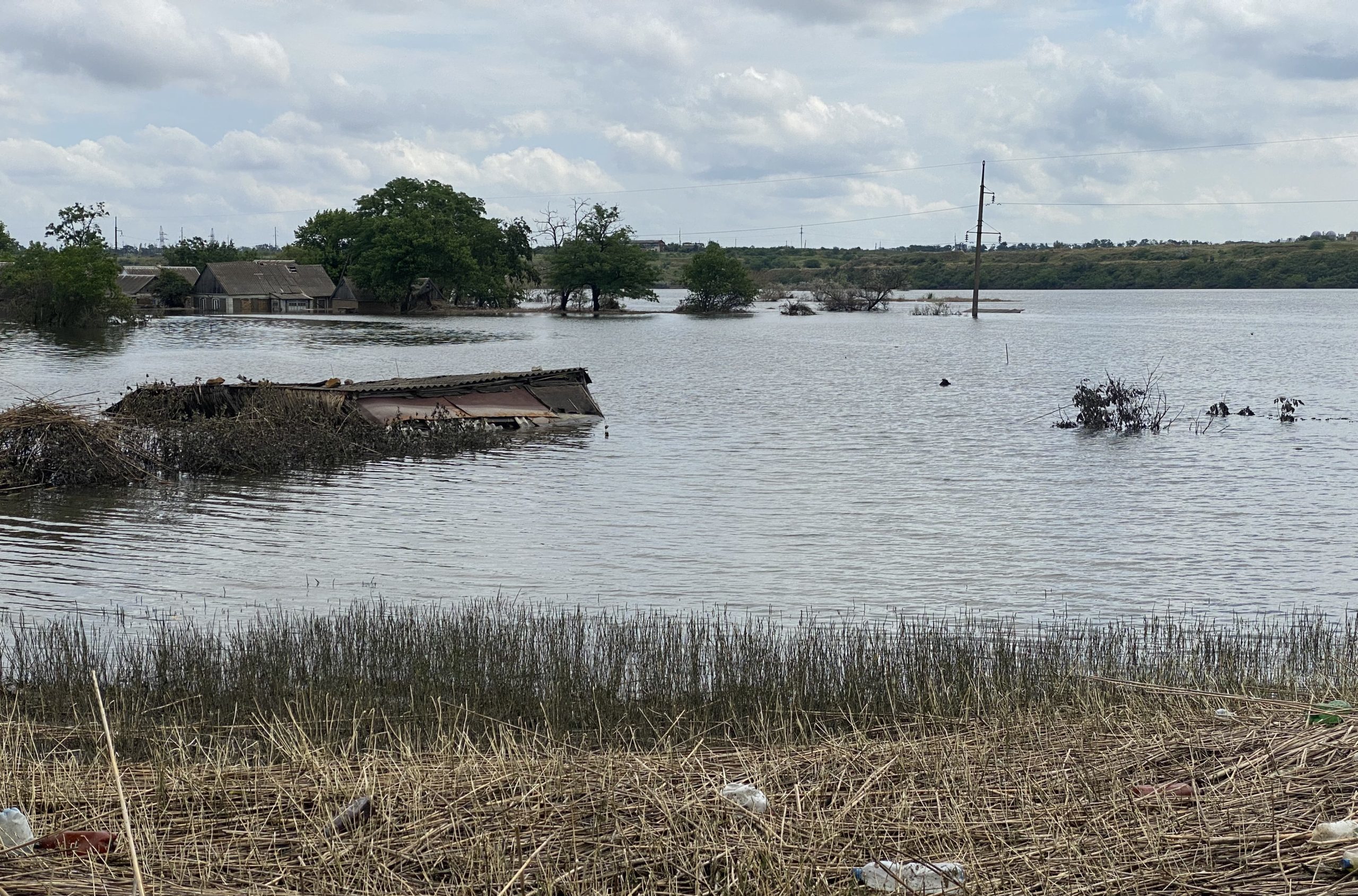 Федорівка Херсонської області, 13 червня 2023 року. Фото: Олеся ЛанцманНа ближчому плані останнього фото видно дах споруди, в якій до повені зберігали сіно, далі – затоплені будинки на крайній вулиці села.