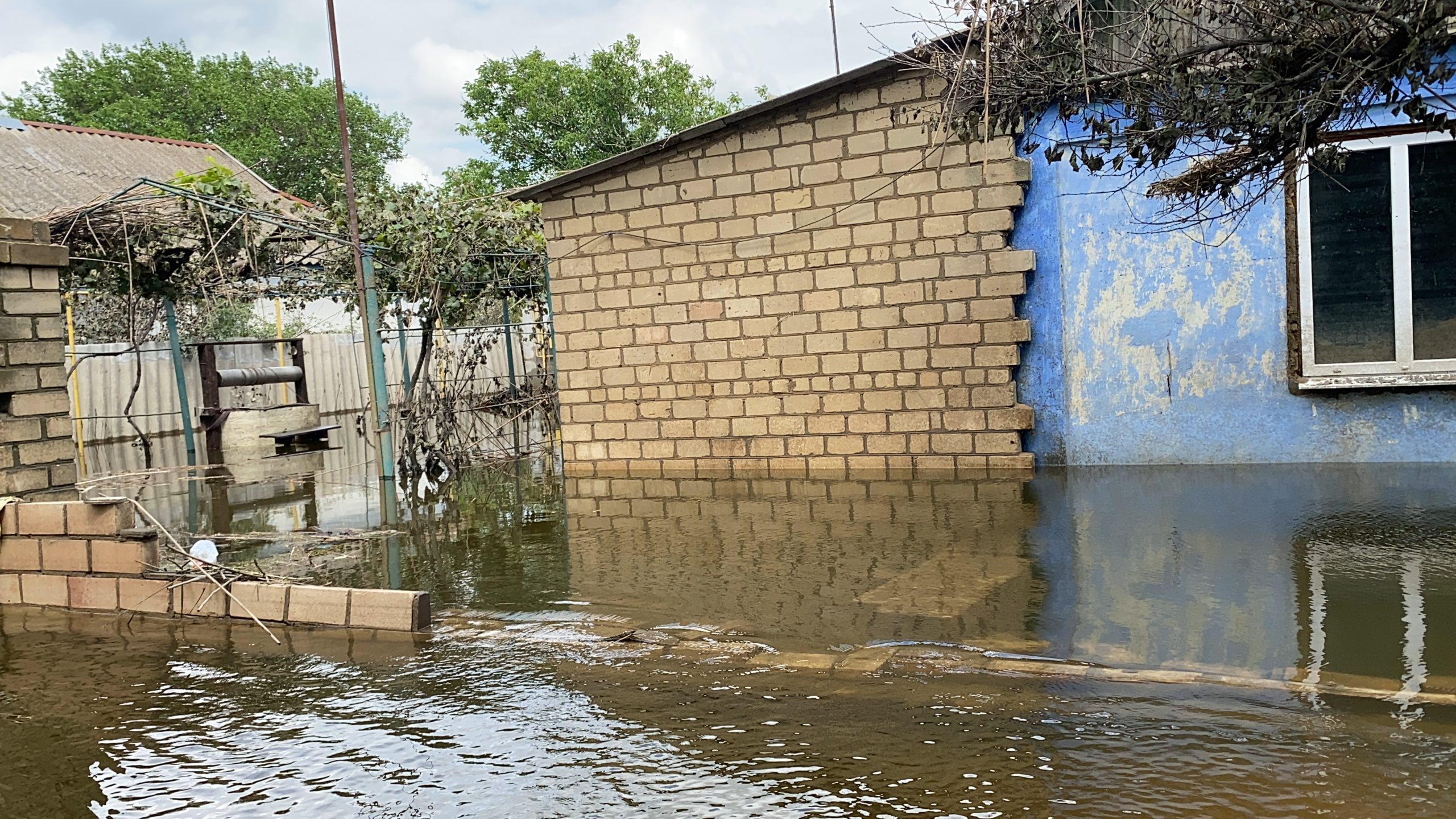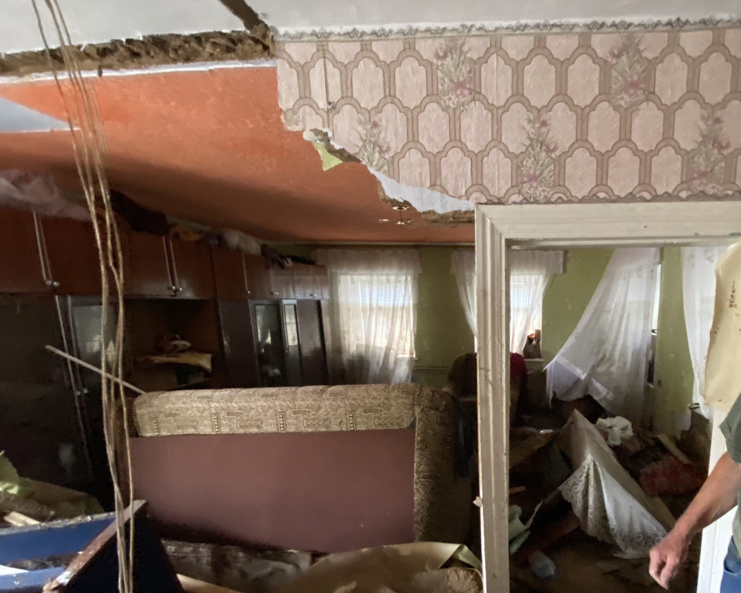 У цей час за нами підпливає сусід на човні, і далі ми рухаємося водою. Через повалений паркан бачимо, що рівень води у дворі Юрія ще десь по коліна, тобто зайти в хату поки не можна. Але крізь вікна можна побачити, що в кухні й одній з кімнат обвалилася стеля.