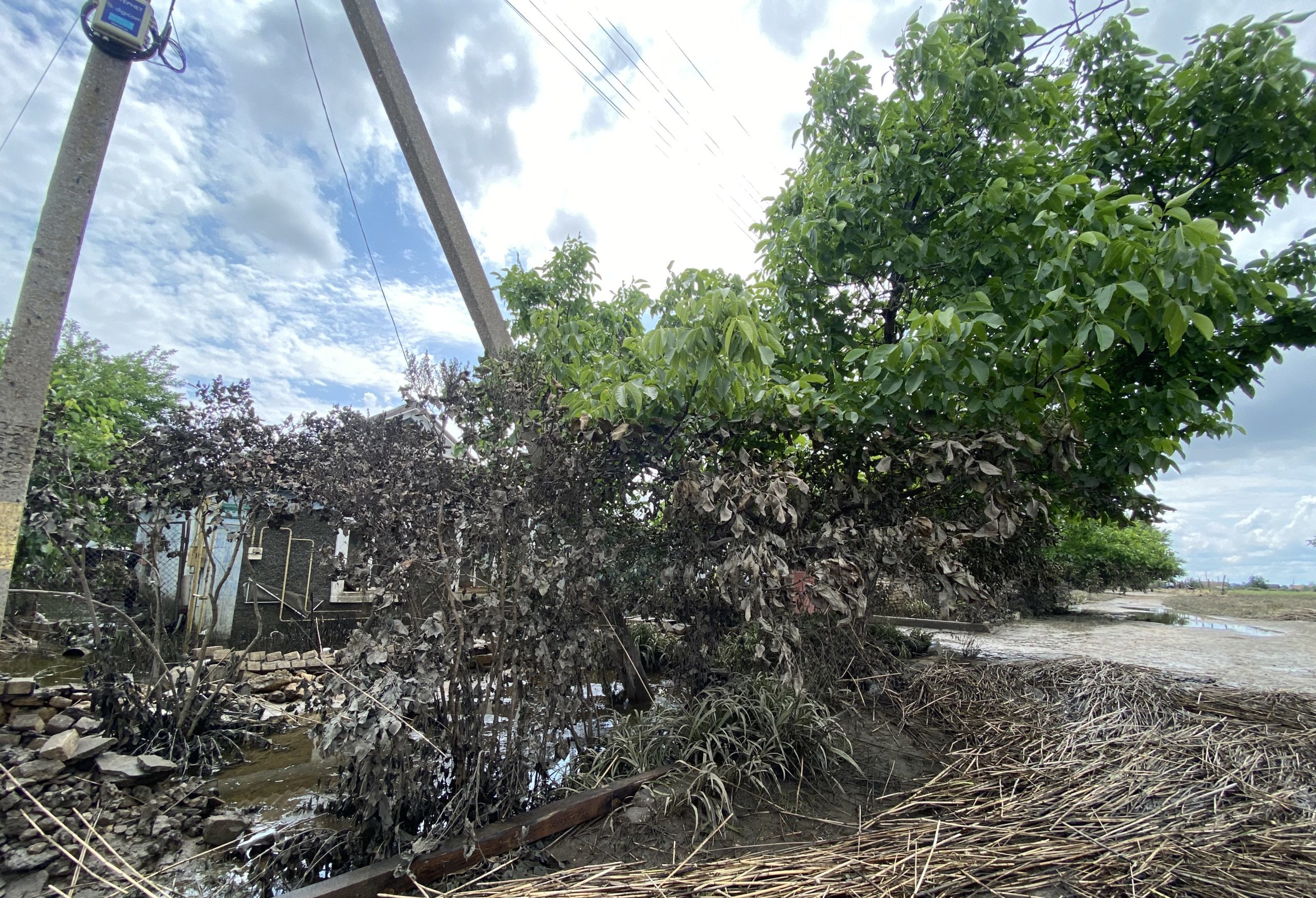 Поки чекаємо на човен, бо дістатися до будинку чоловіка можна лише в такий спосіб, помічаю, що рослини, які були у воді, наче попалені. Дуже добре це видно на горіху: листя, які вище, яскраво-зелені й соковиті, а ті, що ближче до землі, сухі й чорні.