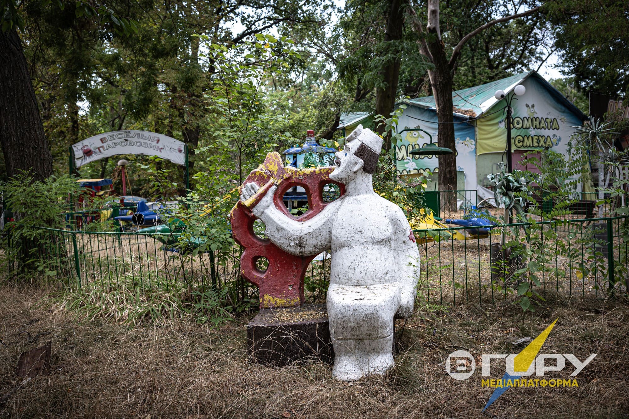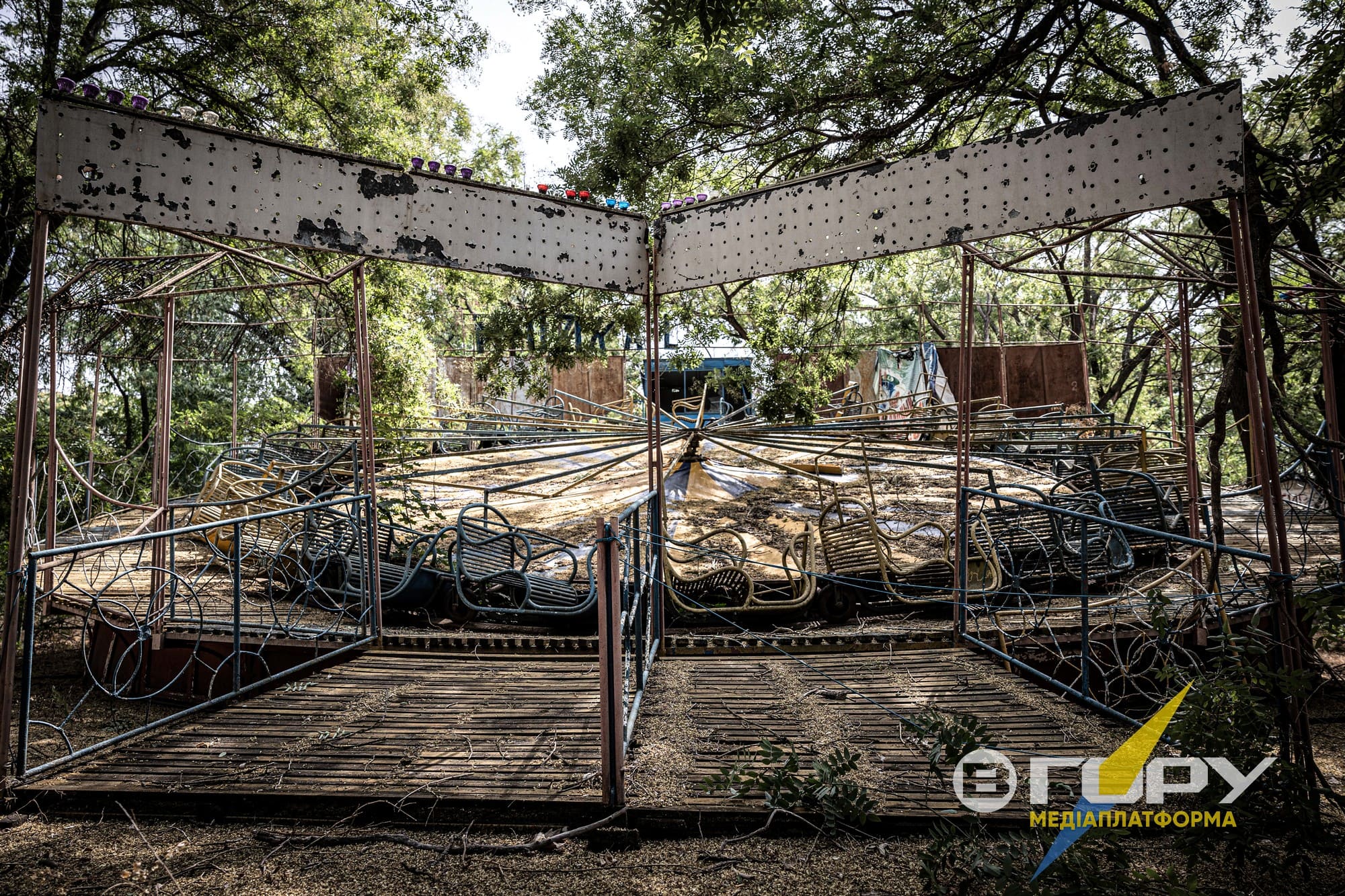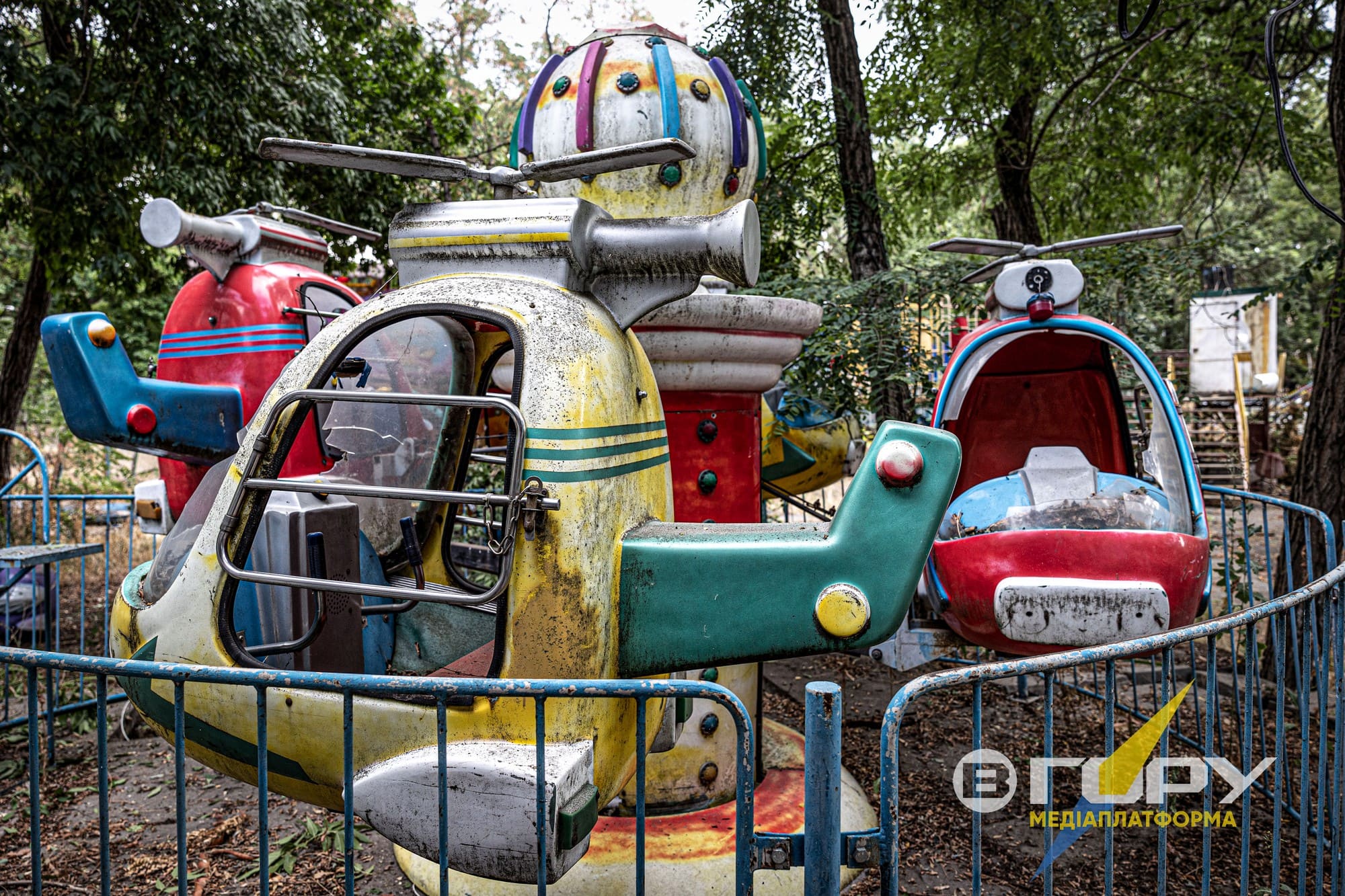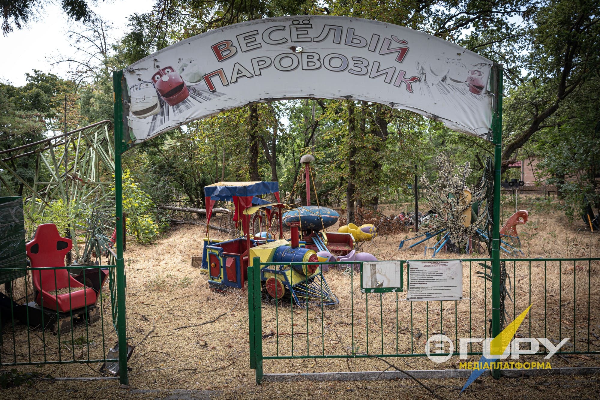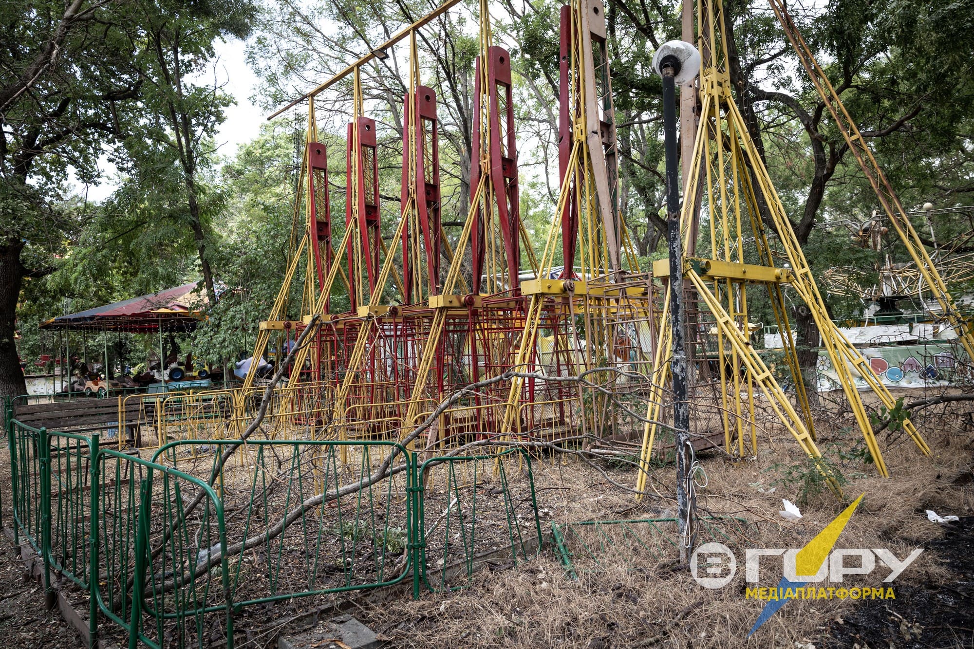 Побиті уламками російських снарядів атракціони в парку Шевченка заростають травою. Мабуть, в кожного херсонця зринуть щасливі спогади про це місце, і бачити його в такому стані дуже боляче. Атракціони, пошкоджені російськими мінами та снарядами, стають символом трагедії, яка охопила багато регіонів під час бойових дій. Замість сміху і радості, які колись панували навколо дитячих майданчиків, ці місця тепер нагадують про жахи війни. Розбиті сидіння, скручені металеві конструкції та сліди від вибухів на землі - все це свідчить про безжалісність конфлікту і втрату безпечних місць для дітей. Ці атракціони, колись призначені для радості та веселощів, тепер стали мовчазними свідками війни і руйнувань.