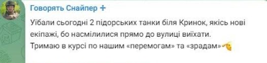 У свою чергу, блогер Станіслав Бунятов (боєць 24-го окремого штурмового батальйону «Айдар» ЗСУ з позивним Осман) у своєму Телеграм-каналі «Говорять Снайпер» розповів, що сьогодні під Кринками наші захисники знищили два танки загарбників, які атакували наші позиції.