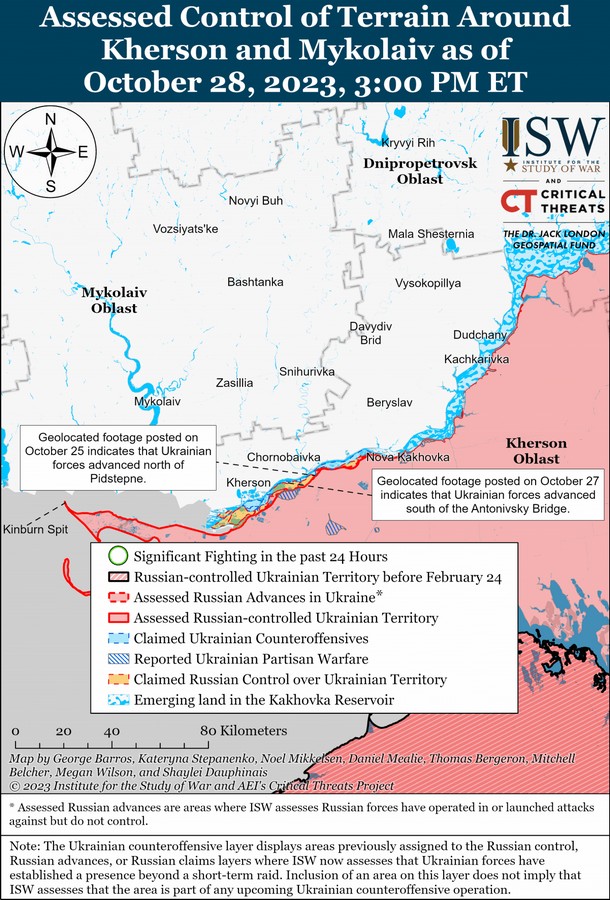 Напередодні у ISW повідомляли, що ЗСУ просунулися далі на південь під Антонівським автодорожнім мостом на північ від Олешок. Це 7 км на південь від Херсона і 4 км від річки Дніпро. На лівому березі Дніпра нібито діє сім українських "штурмових груп".За словами експертів, загарбники почали усвідомлювати безпорадність угруповання "Дніпро" на лівому березі Херсонської області.