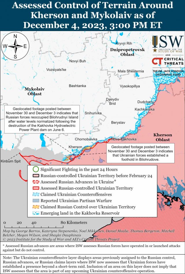 Геолоковані кадри, опубліковані 30 листопада, 1 грудня та 3 грудня, свідчать, що ЗСУ вступили в бій з російськими військами в населеному пункті Білогрудове (11 км на південний захід від Херсона). Як припускають в ISW, це вказує на те, що російські війська, ймовірно, контролюють більшу частину острова Білодрудів, а українські сили нещодавно зайняли позиції поблизу села Білогрудове.