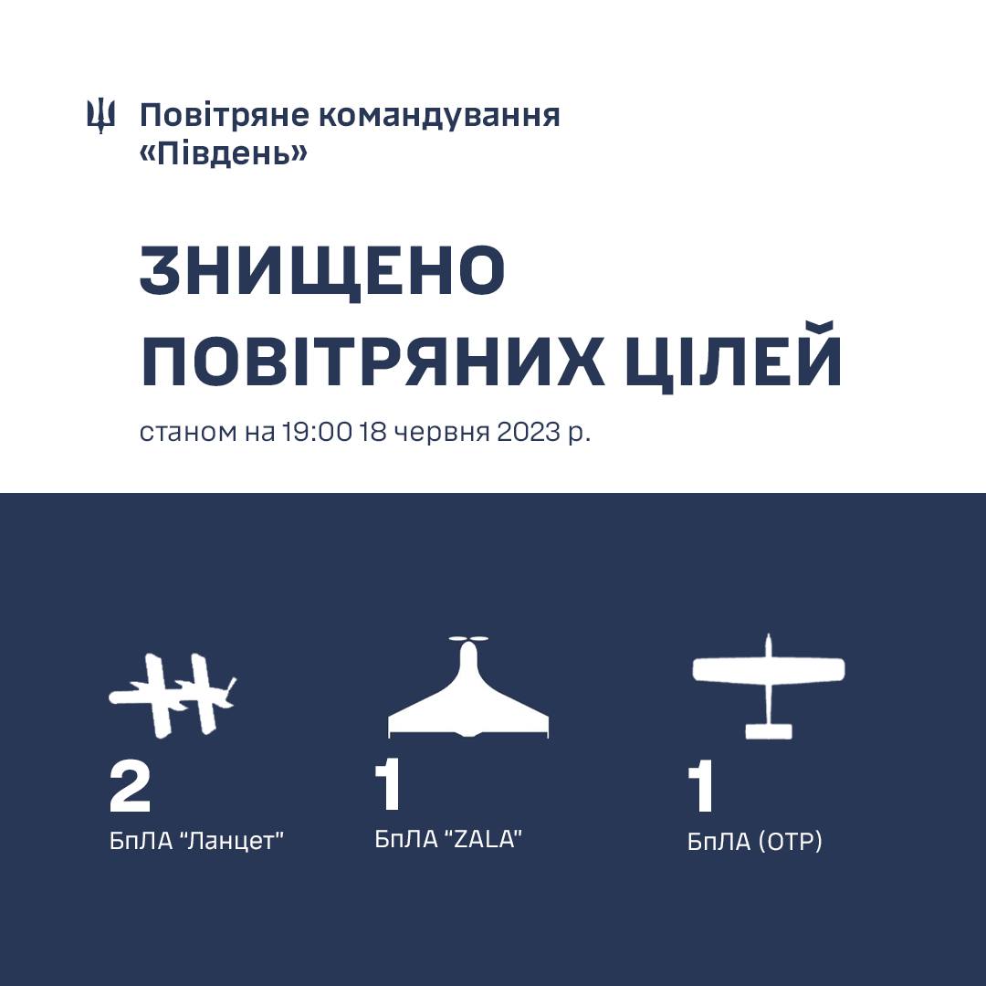 "18 червня 2023 року силами та засобами протиповітряної оборони повітряного командування "Південь" знищено: на Херсонщині - два ударних БпЛА “Ланцет” та один БпЛА “ZALA”, на Миколаївщині - один БпЛА оперативно-тактичного рівня", - ідеться у повідомлені.