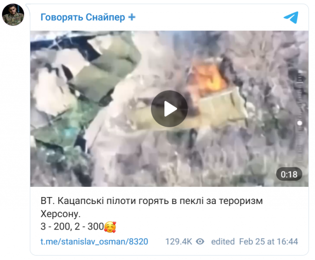 Він оприлюднив відповідне відео, змонтоване з кадрів, відзнятих нашим БПЛА, з коментарем: «Кацапські пілоти горять в пеклі за тероризм Херсону. Троє «двохсотих», двоє «трьохсотих».