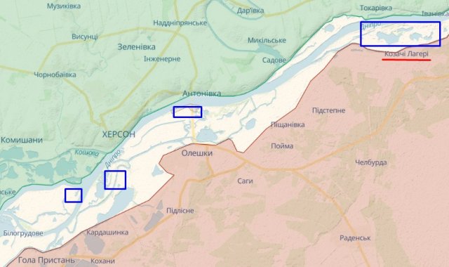 Разом з тим, ЗСУ не можуть штурмувати з заплав населені пункти (ті ж Козачі Лагері чи Олешки), оскільки поки що не можуть переправити через річку важку бронетехніку.
