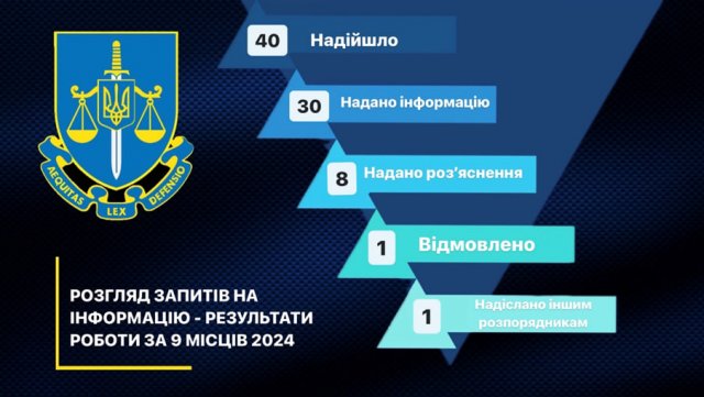 Прокуратурою також забезпечується виконання вимог Закону України «Про доступ до публічної інформації». У звітному періоді розглянуто 39 запитів на публічну інформацію, з них на 30 - інформацію надано, 8 запитувачам скеровано роз'яснення.