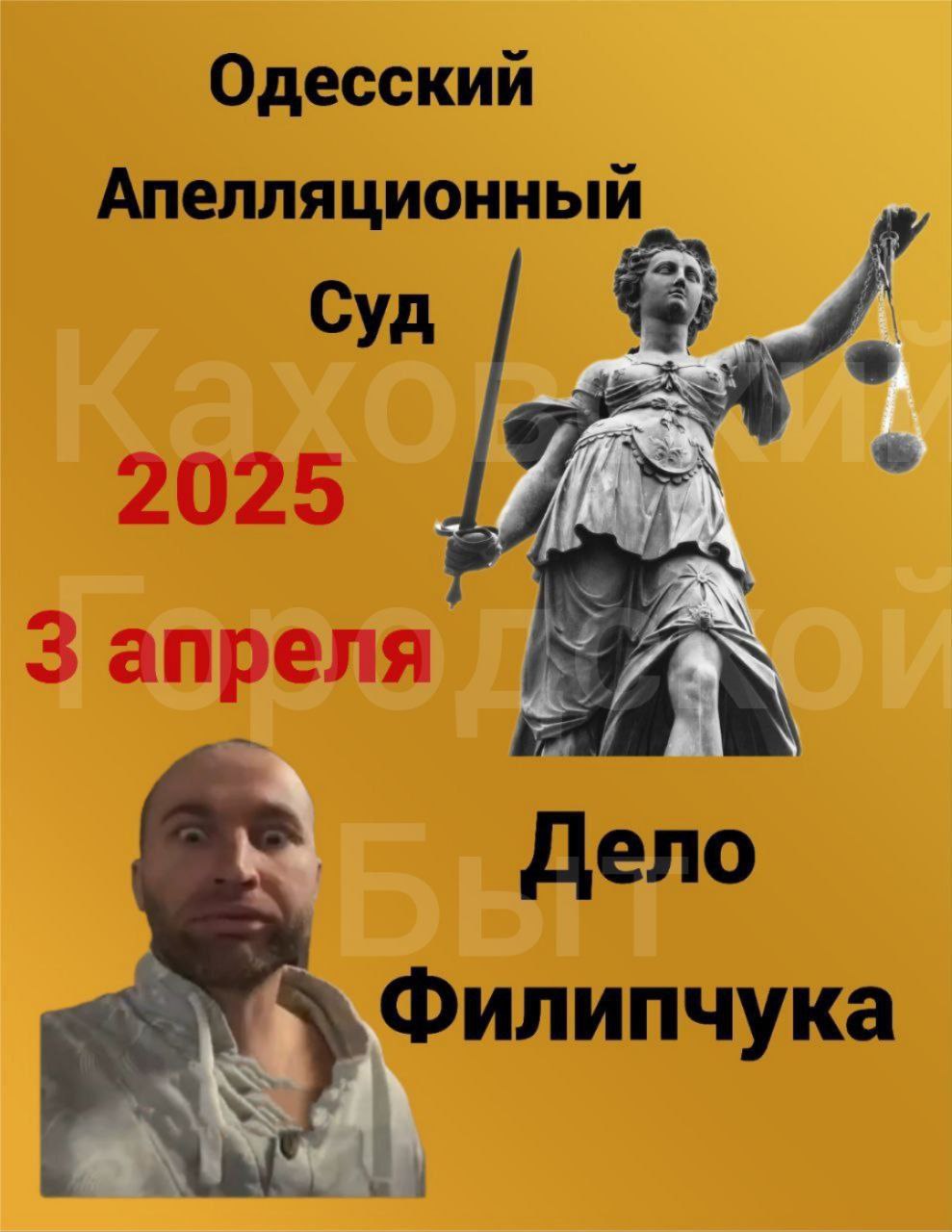 «Пані і панове, всього тиждень залишився до початку грандіозного спектаклю! – іронізує окупаційний телеграм-канал «Каховский Городской Быт». – На арені одеського апеляційного суду – сам Філіпчук, зірка каховської політичної сцени, борець за честь, гідність і справедливість!» Так, як не дико це звучить, але зрадник Філіпчук, на якому ніде клейма ставити, звернувся у апеляційний суд проти звинувачення його у державній зраді. Такий вирок, нагадаємо 1 листопада 2024 року виніс Суворовський районний суд Одеси, призначивши зраднику 15 років позбавлення волі (відлік має початись у момент фактичного затримання окупаційного голови).